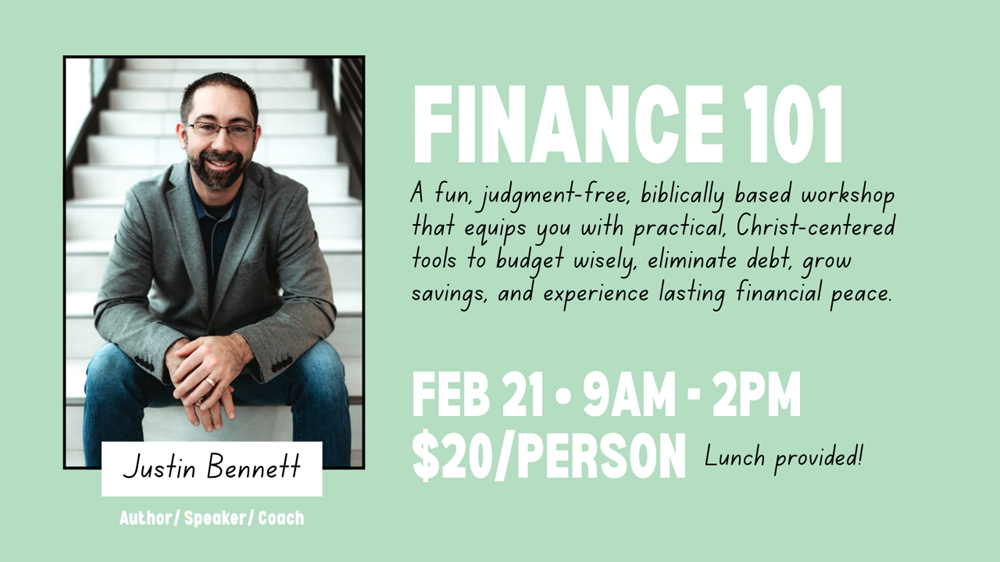 Struggling with debt, little savings, or constant money stress? Finance 101 is a practical, biblically based workshop designed to help you break free from living paycheck-to-paycheck and step into financial freedom. Led by Justin Bennett, author, speaker, and financial consultant, this fun, interactive, and judgment-free workshop teaches a proven, Christ-centered process to create and live on a budget, increase savings, eliminate debt, and cultivate generosity. Gain tools to get on the same page with your spouse, teach your children healthy money habits, and finally experience the peace of managing your finances God’s way.